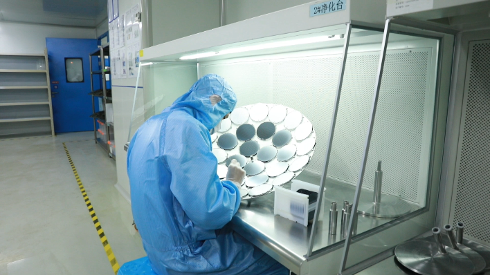 在無(wú)塵車間里,機(jī)器一刻不停運(yùn)轉(zhuǎn)著,操作人員正在進(jìn)行裝片。